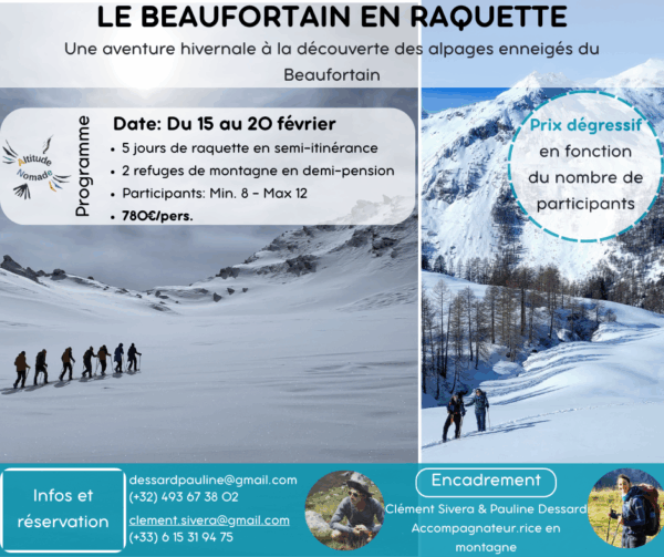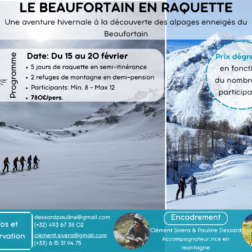 Le prix de l’inscription est de 780 €, il comprend : la participation aux 5 nuitées en refuge et demi-pension (comprenant les petits déjeuners et soupers); une séance d’info pour se rencontrer autour d’une présentation du voyage; la participation à la politique en matière d’environnement; les frais d’organisation et d’accompagnement et La location des raquettes et kits de sécurité (pelle, sonde et DVA).